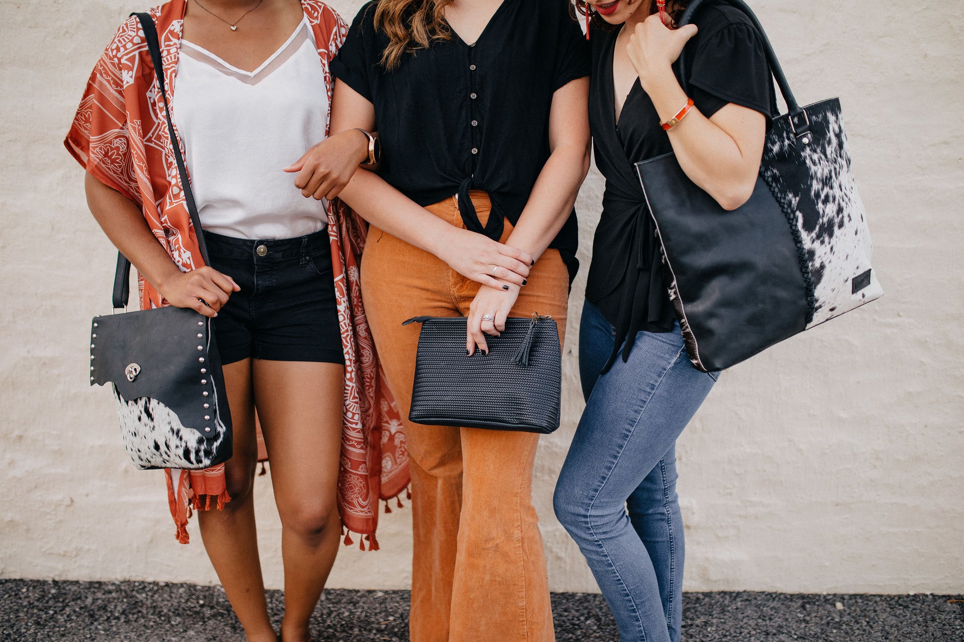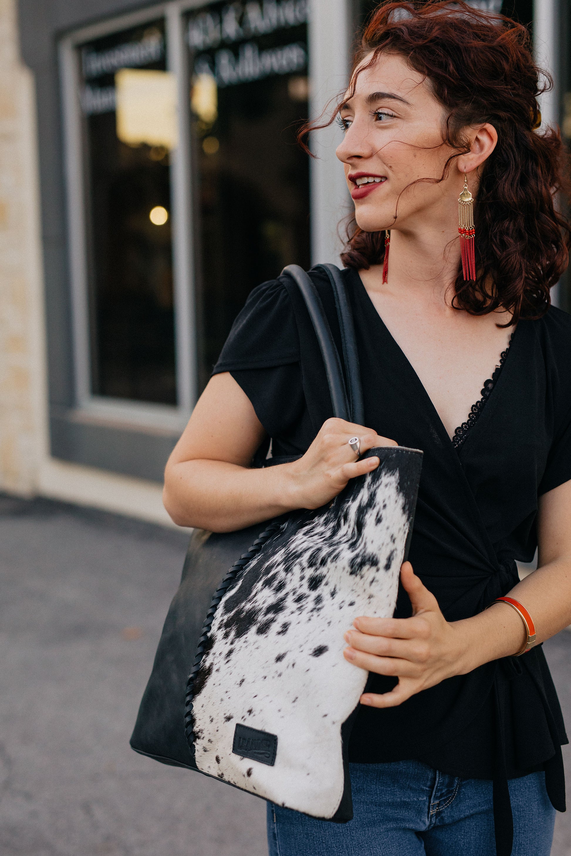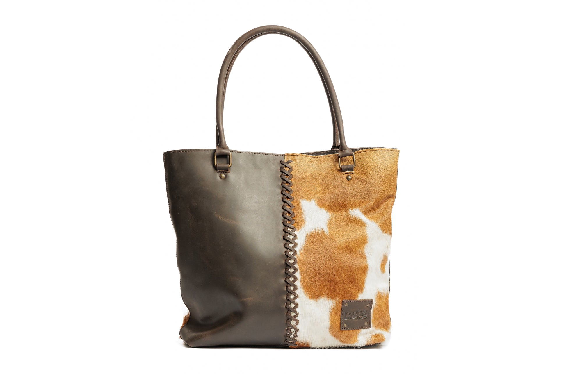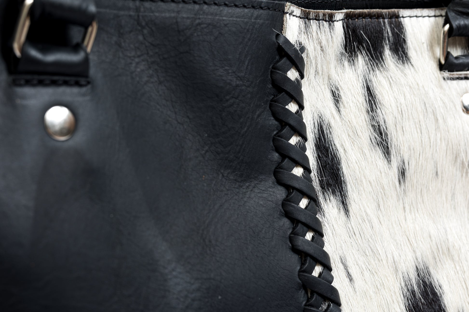 Introducing Rickie, the hot cowhide tote that's sure to turn heads! Handcrafted from a luxe mix of hair-on cowhide and smooth leather, it features hand-stitched detail, dreamy rolled leather handles, an interior zip pocket and accessory pouches, and a magnetic snap closure. So go ahead, take Rickie out for a spin - you'll be totes impressed! (17" x 15"; 10" handles)
